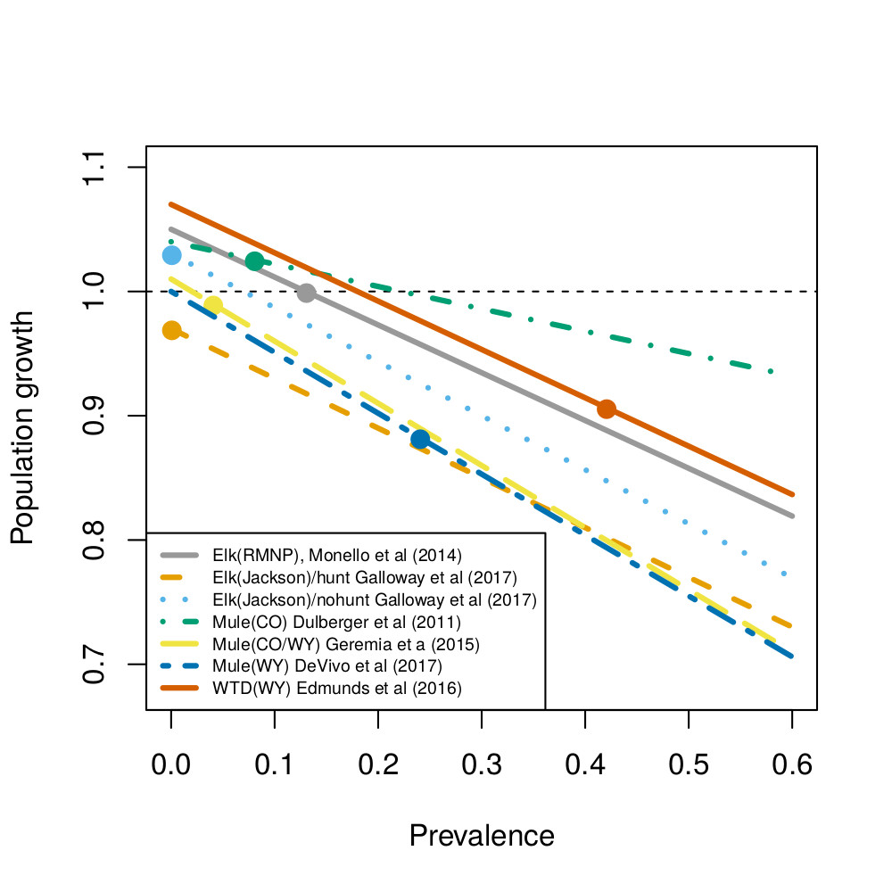Population models of different cervids indicate that once female CWD prevalence reaches a species-specific threshold, the combined effects on survival and recruitment lead to population declines (See figure above). This threshold depends on species demographics, hunter harvest, and other mortality pressures. In contrast, observable population effects are unlikely early in the disease cycle, when prevalence is low and little mortality is attributed to the disease. Genetic selection also confounds long-term population predictions because increasing the number of lower susceptible animals will decrease disease-associated mortality, through lower infection rates and prolonged pre-clinical incubation [8]. Population monitoring effort should be increased in areas with high or increasing prevalence because population declines are likely. Additionally, population studies in the endemic areas of Colorado and Wyoming have not examined other limiting factors that could also contribute to population declines, including habitat loss, climate change, and population reductions, to mitigate the effects of over-browsing [3,5].