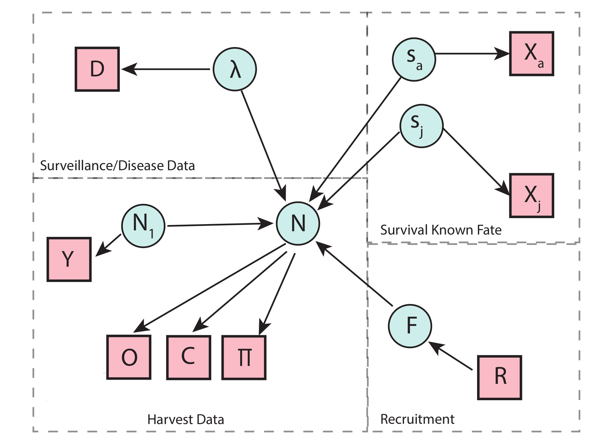 I’ve omitted study area to aid in viewing because this model grows in dimension quickly. Ultimately this process model is founded in a leslie matrix formulation, so all of the assumptions of that modeling framework apply here, including, for example Mathulsian population growth.