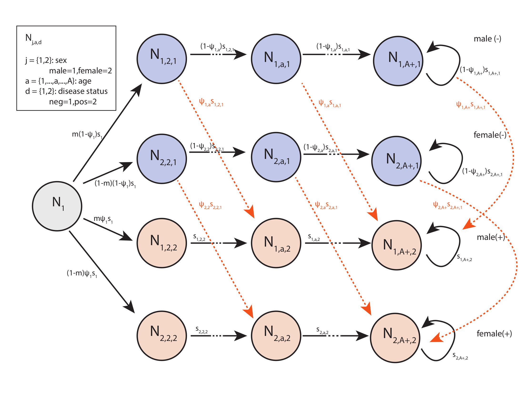 The following simplified life history diagram only incorporates disease status, age, and sex.