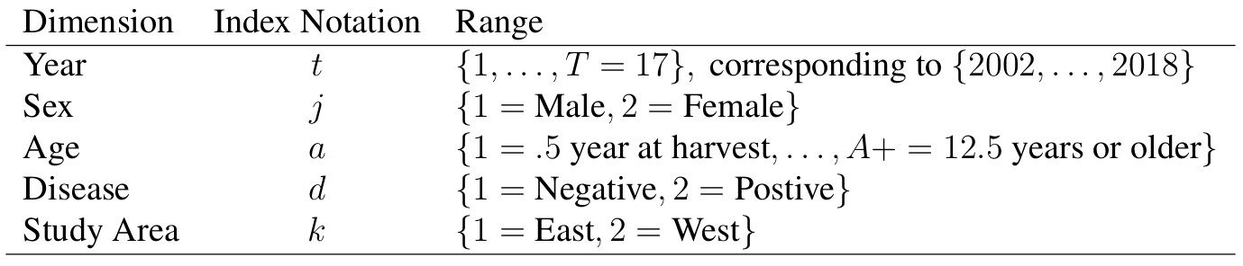 In our present study, we have the additional challenge of needing to model disease dynamics that are highly heterogeneous. CWD transmission has been shown to vary across age classes, sex, PRNP genotype, with spatial and temporal dependence. We will use surveillance data from hunter harvested deer that have been tested for chronic wasting disease since 2002.