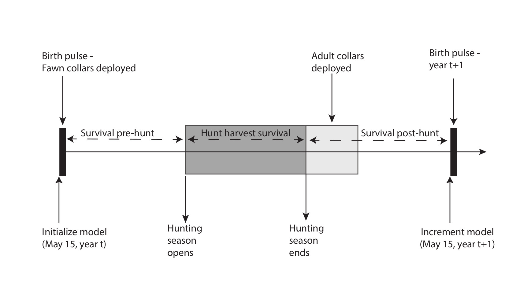 An annual timeline of events, similar to Fieberg et al. (2010) and Gast (2013), was created to help with formulating important phenomenon pertaining to the annual life cycle considering surveys/collaring, harvest, and the birth pulse.