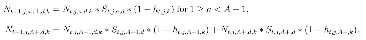 mortality outside of hunter harvest. Predicted “true” abundance for each state variable is given by a series of two equations. The second equation is necessary to account for the terminal age class, denoted (A+) representing the fact that individuals that are 12.5 years of age or older remain in that age class.