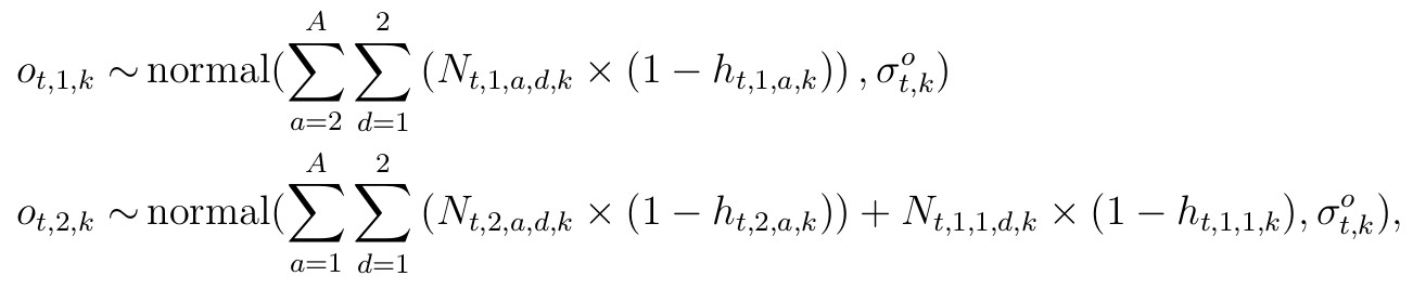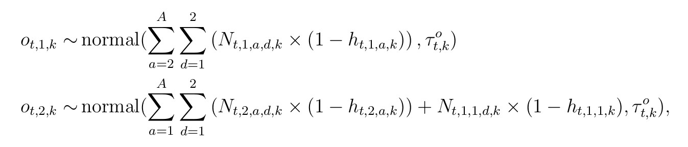 For the years 2002-2012, we have observed harvest of antlered/antlerless groups according to section. We can use the total from these sections that align with the study area boundaries (O). Thus these observed counts of anterled or antlerless harvested individuals are denoted O with dimensions (t) for years, j for group (antlered or antlerless), and study area (k), that is given by two independent normal distributions